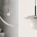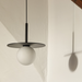 The MIRO S pendant lamp presents a quietly striking silhouette: a slim matte-black stem descending into a perfectly blown opal glass globe. The disc element—whether in alabaster, ceramic, or brushed black metal—adds a horizontal counterpoint that visually anchors the orb beneath it. Each material gives the lamp a distinct personality: alabaster glows with mineral translucency, ceramic offers artisanal tactility, and metal introduces a clean architectural line.